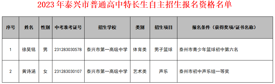 2023年泰兴市普通高中特长生自主招生报名资格名单