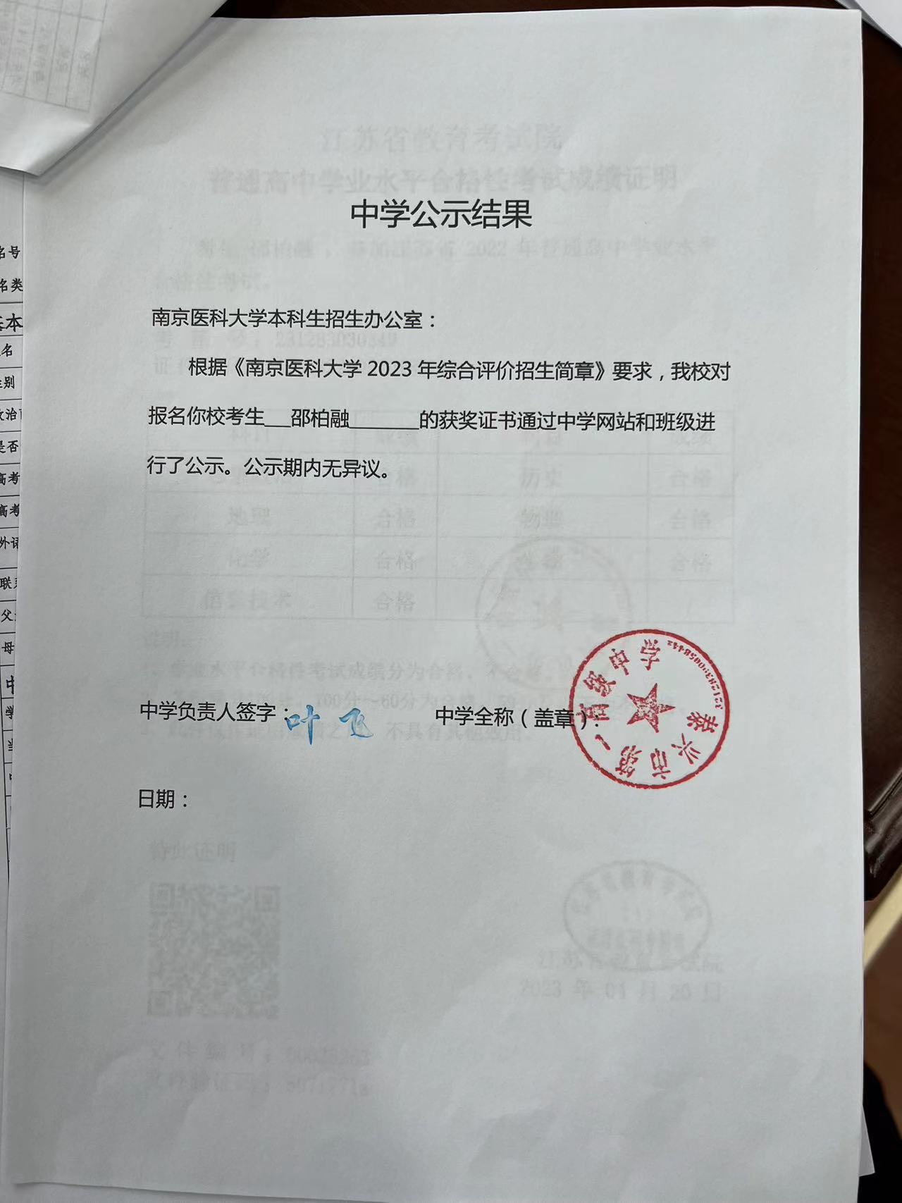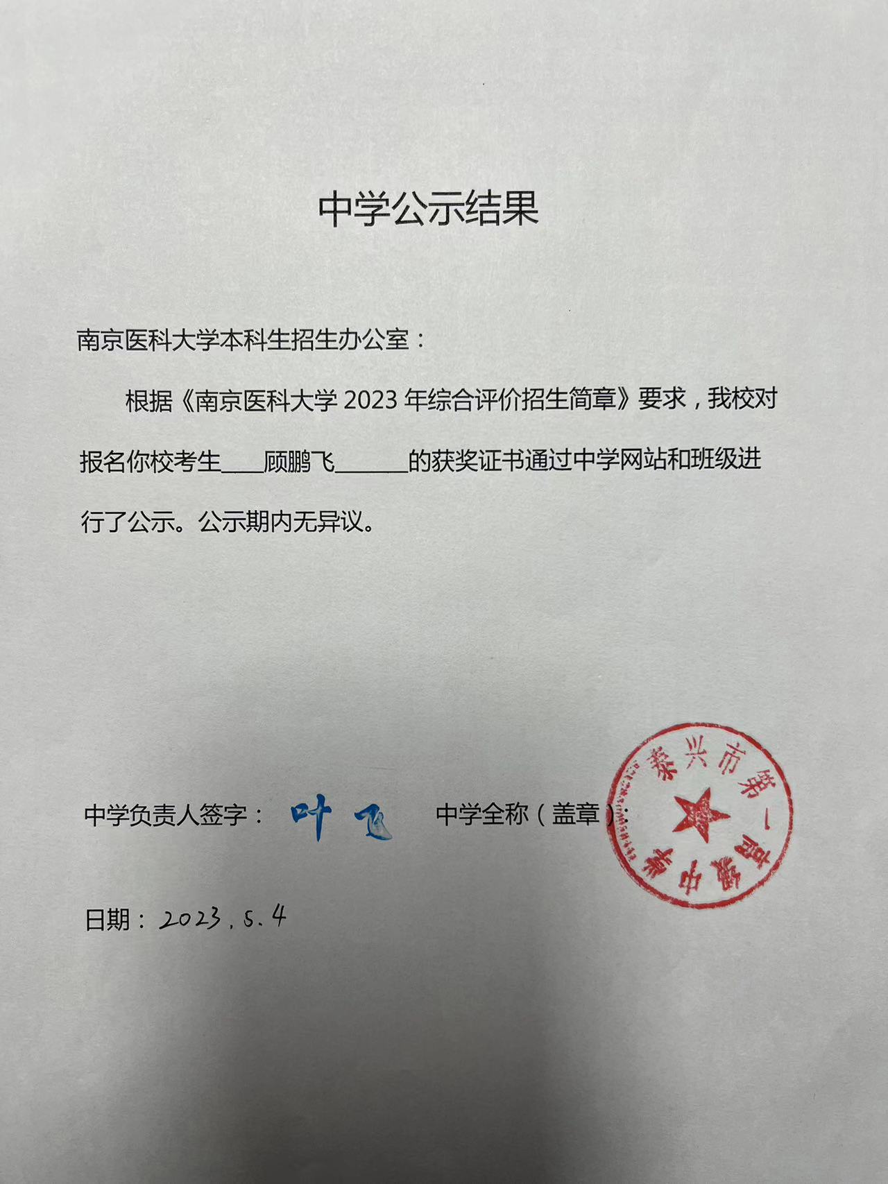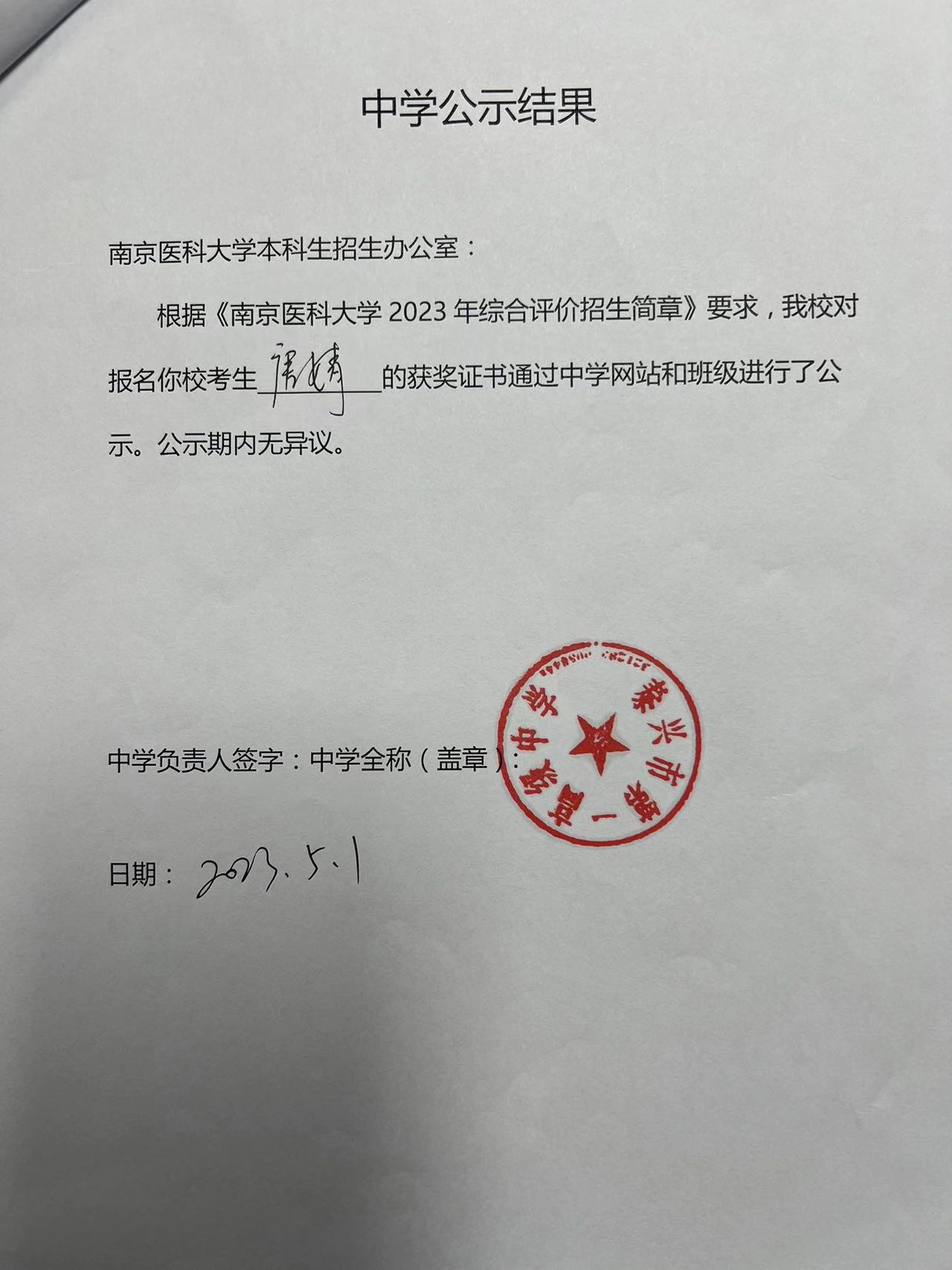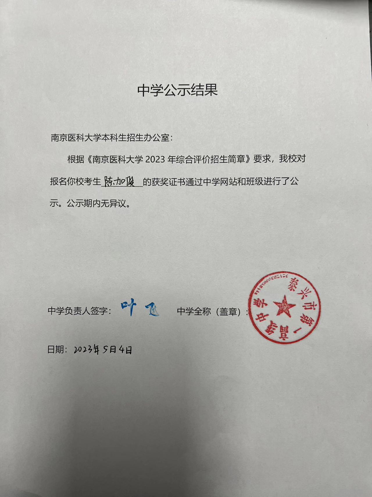 中学公示结果