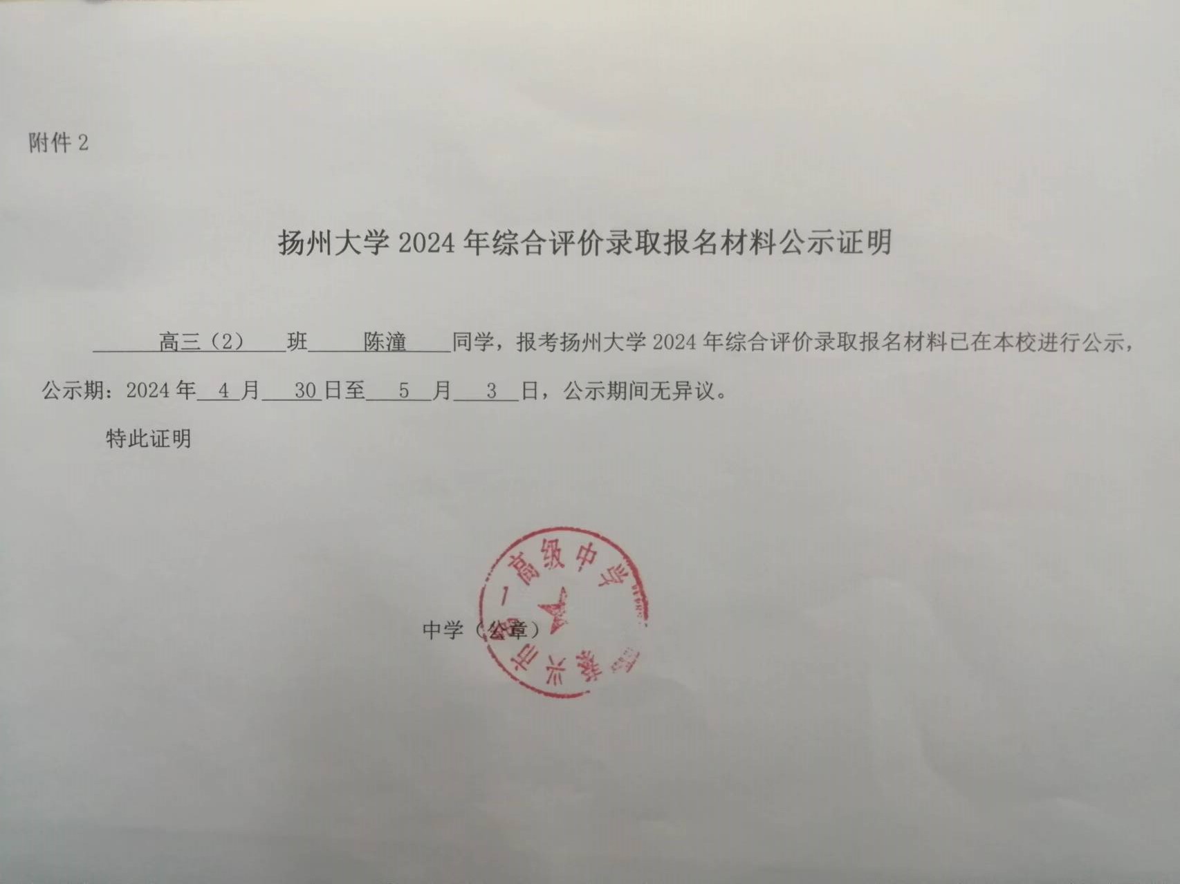 扬州大学2024年综合评价录取报名材料公示证明