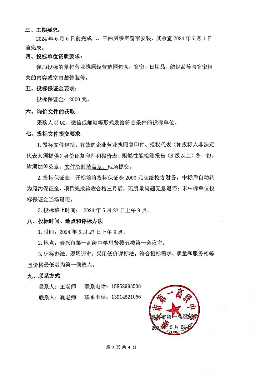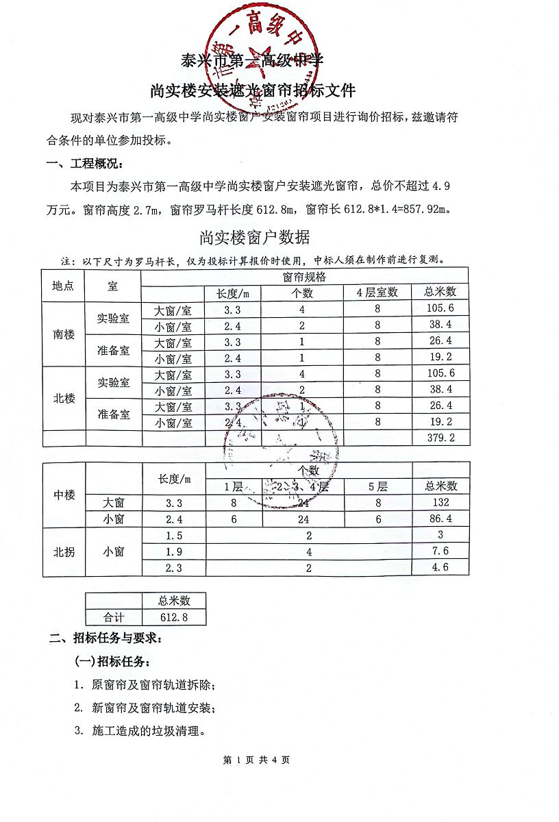泰兴市第一高级中学尚实楼安装遮光窗帘招标文件