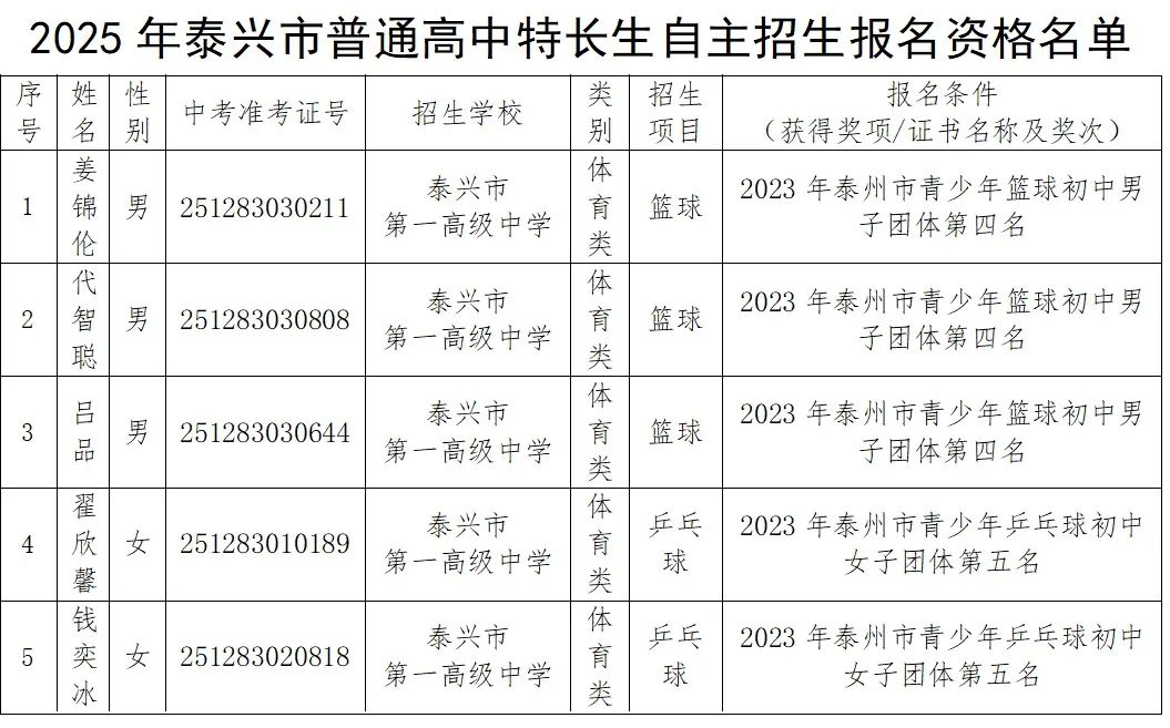 根据《关于印发2025年泰州市普通高中特长生自主招生工作实施办法的通知》(泰教基〔2025〕1号)文件精神,经我校和泰兴市普通高中特长生自主招生工作领导小组审核组审核,现将2025年泰兴市第一高级中学特长生报名资格名单予以公示(具体名单如下)。公示时间:2025年4月25日—30日。如有异议,请向我校及泰兴市教育局反映,联系电话:15052376668(泰兴市第一高级中学)、87728181(市纪委监委第八派驻纪检监察组)、87728168(监察室)、 87728120(基教科)。