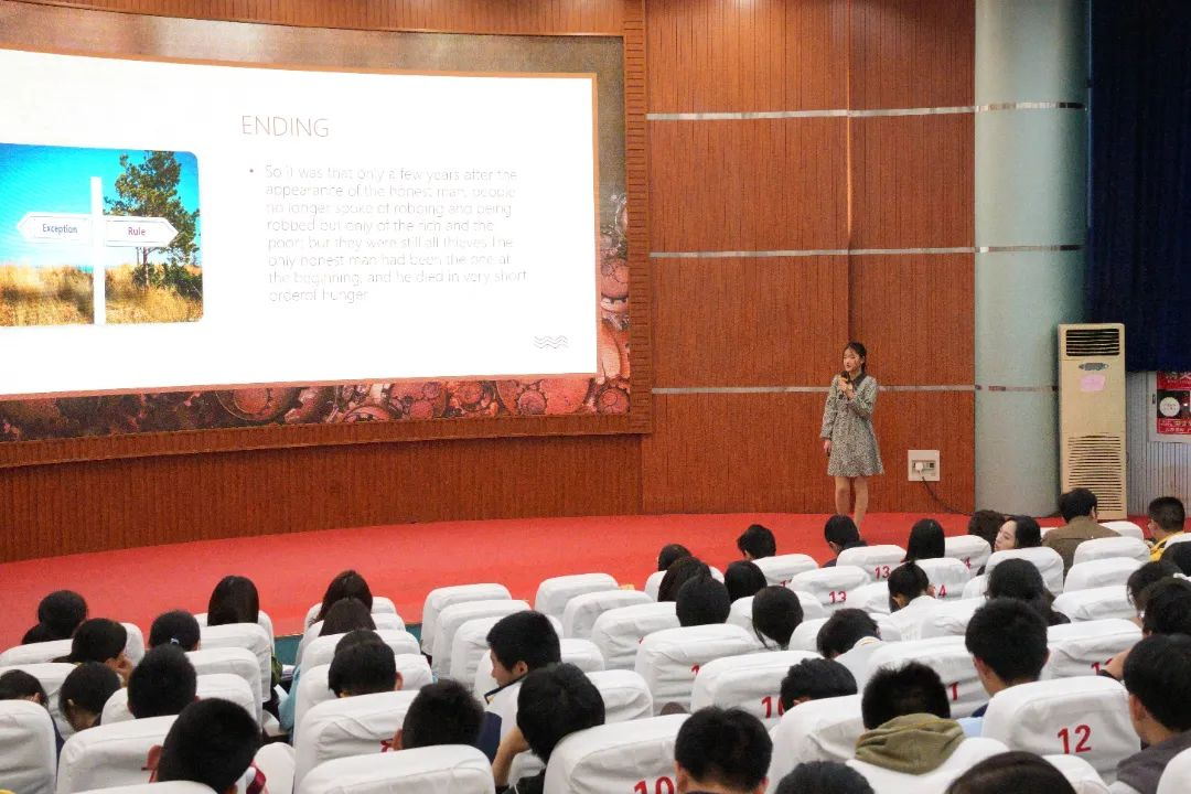 赛前,选手们在任课老师的指导下,斟酌内容,制作PPT,揣摩语音、语调,经过班级选拔、年级初选,最终21组选手晋级决赛。在此过程中,他们拓展英语原著阅读的兴趣和口语表达的能力不断被激发。