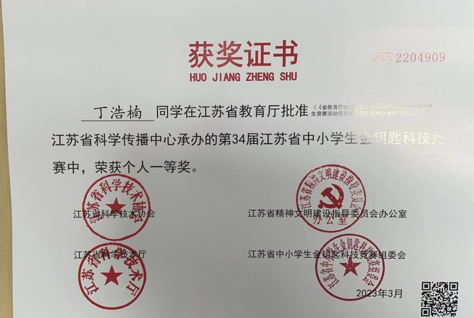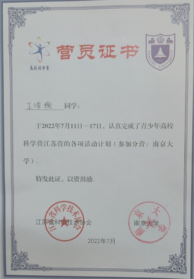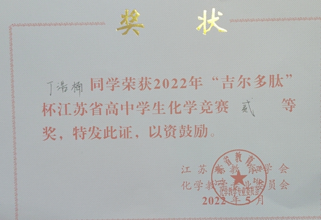泰兴市第一高级中学高二(8)班班长。2023年江苏省“优秀学生干部”;2023年泰兴市“美德少年”;2022年泰兴市“优秀团干部”“优秀班干部”;2022江苏省“吉尔多肽”杯高中生化学竞赛获贰等奖,2023年江苏省中小学生“金钥匙”科技竞赛获得个人一等奖。在最近的一次期中全市联考中,理科类全市第53名。