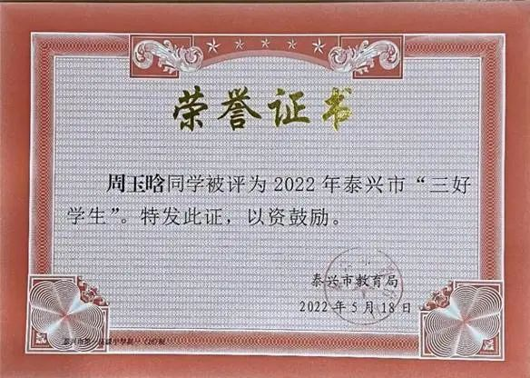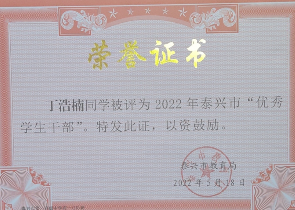 泰兴市第一高级中学高二(14)文科实验班班长。学生会总主席;2022泰兴市“三好学生”;2022泰兴市“优秀团员”;共青团泰兴市委委员,共青团泰州市代表;长江大保护志愿者(省级);叶圣陶杯新作文大赛江苏省一等奖、全国总决赛一等奖;江苏省“三好学生”。在最近的一次期中全市联考中,文科类全市第27名。