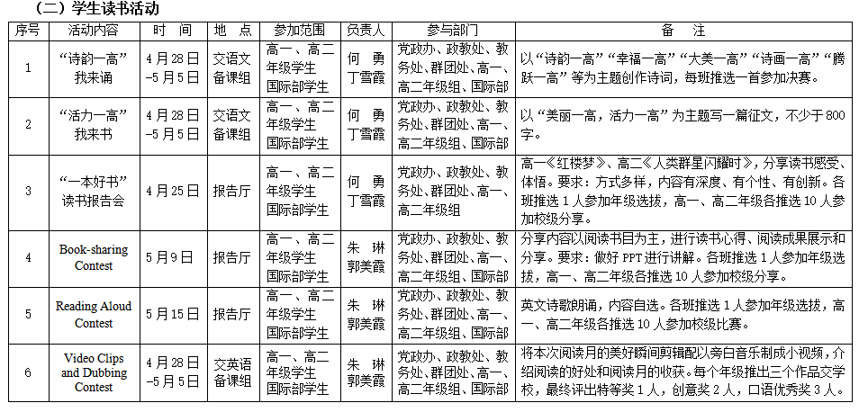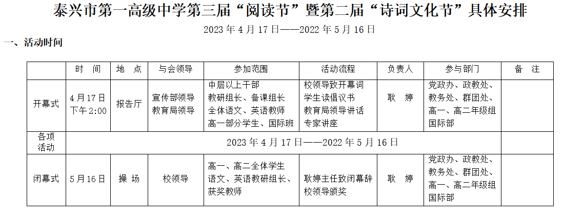 泰兴市第一高级中学第三届“阅读节”暨第二届“诗词文化节”具体安排