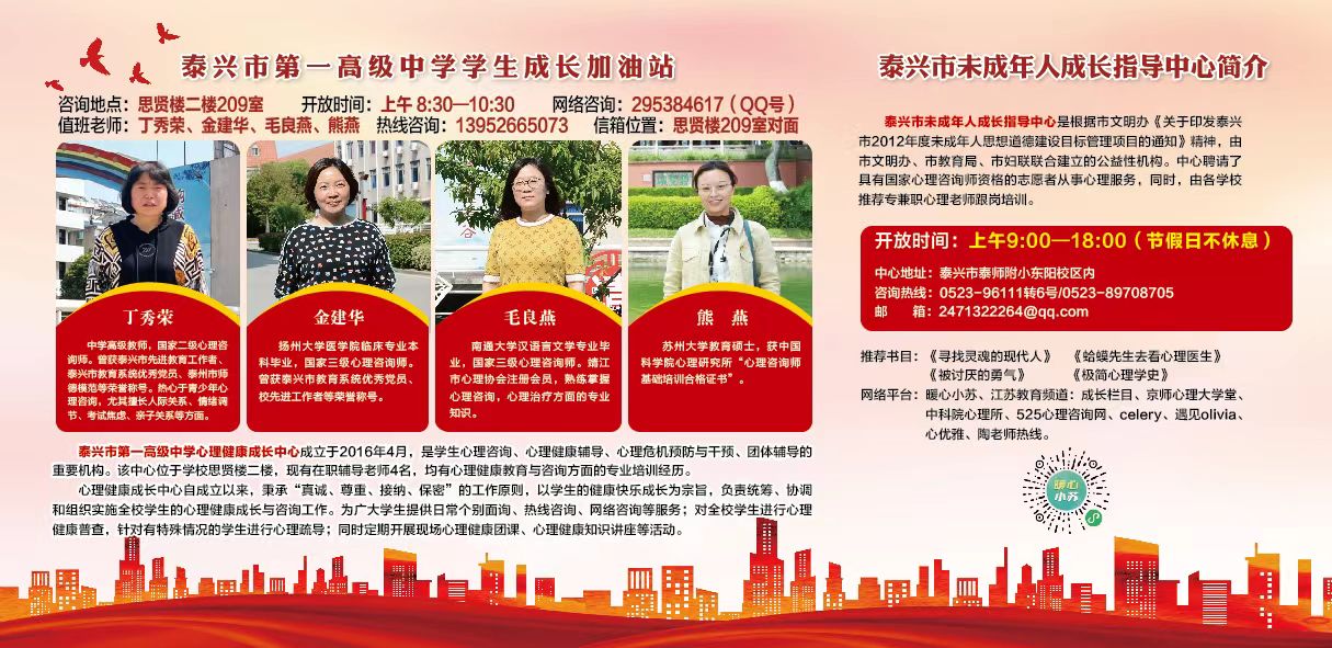 丁秀荣:中学高级教师,国家二级心理咨询师。曾获泰兴市先进教育工作者、泰兴市教育系统优秀党员、泰州市师德模范等荣誉称号。热心于青少年心理咨询,尤其擅长人际关系、情绪调节、考试焦虑、亲子关系等方面。