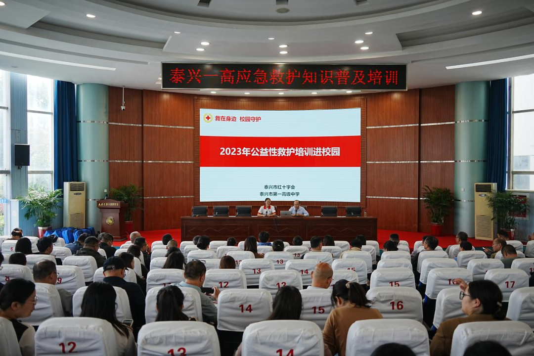 为进一步提高校园内面对突发事件的应急救护和自救互救能力,护航师生身体健康和生命安全,10月6日下午,泰兴市红十字会走进泰兴一高,开展“救在身边·校园守护”应急救护知识普及培训活动,学校政教处成员、各年级组成员、班主任、副班主任和体育老师参加,安全管理中心王毅主任主持。