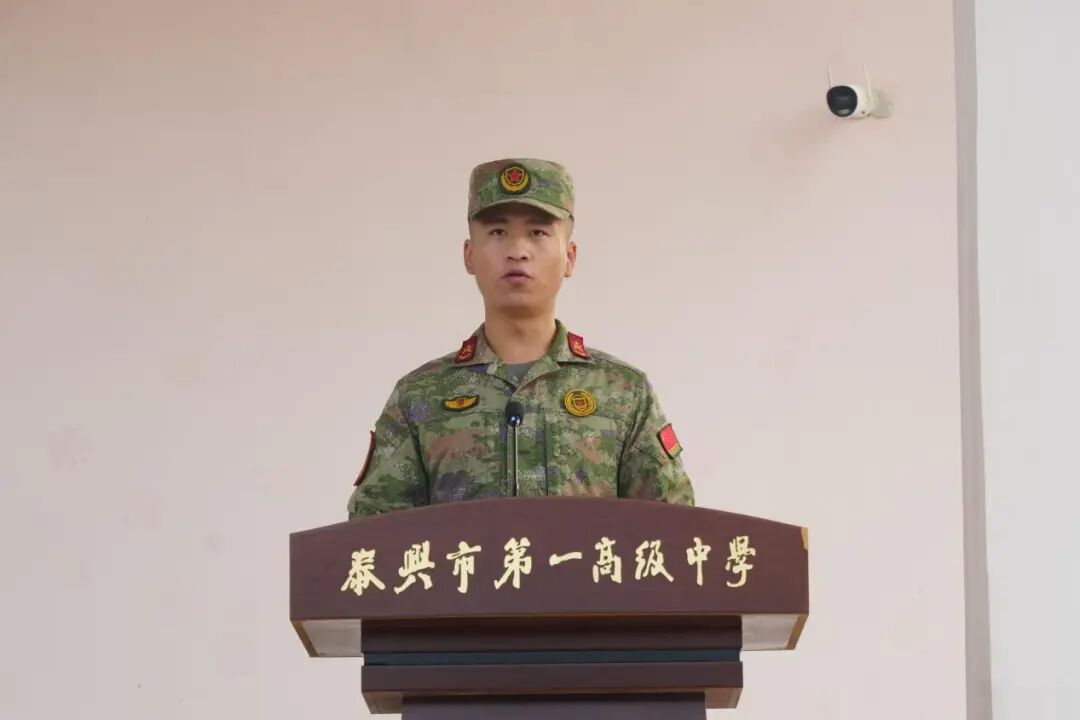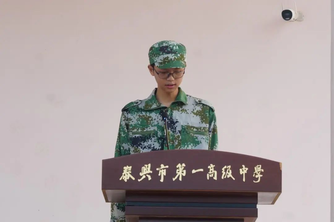 高一(4)班孔子禾作为新生代表发言:“七月泰兴雨丝,恰似成长考验。军训是国防责任,更是意志磨砺必经之路,将为岁月增添浓墨重彩的一笔。”他向全体新生发出倡议:秉持“一高必高”信念,以“军训之名”赴“青春之约”。