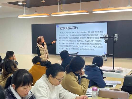 顾琴用“感动、震撼、期待”六个字对三个备课组的汇报进行了总结,并对英语教学提出四点建议:开展词汇分类教学,重视词汇在语境中的应用;将写作贯穿在日常教学中,创设小情境让学生学以致用;培养学生整篇阅读的习惯,重点突破阅读微技能;统筹规划三年教学,分阶段突破重点问题。