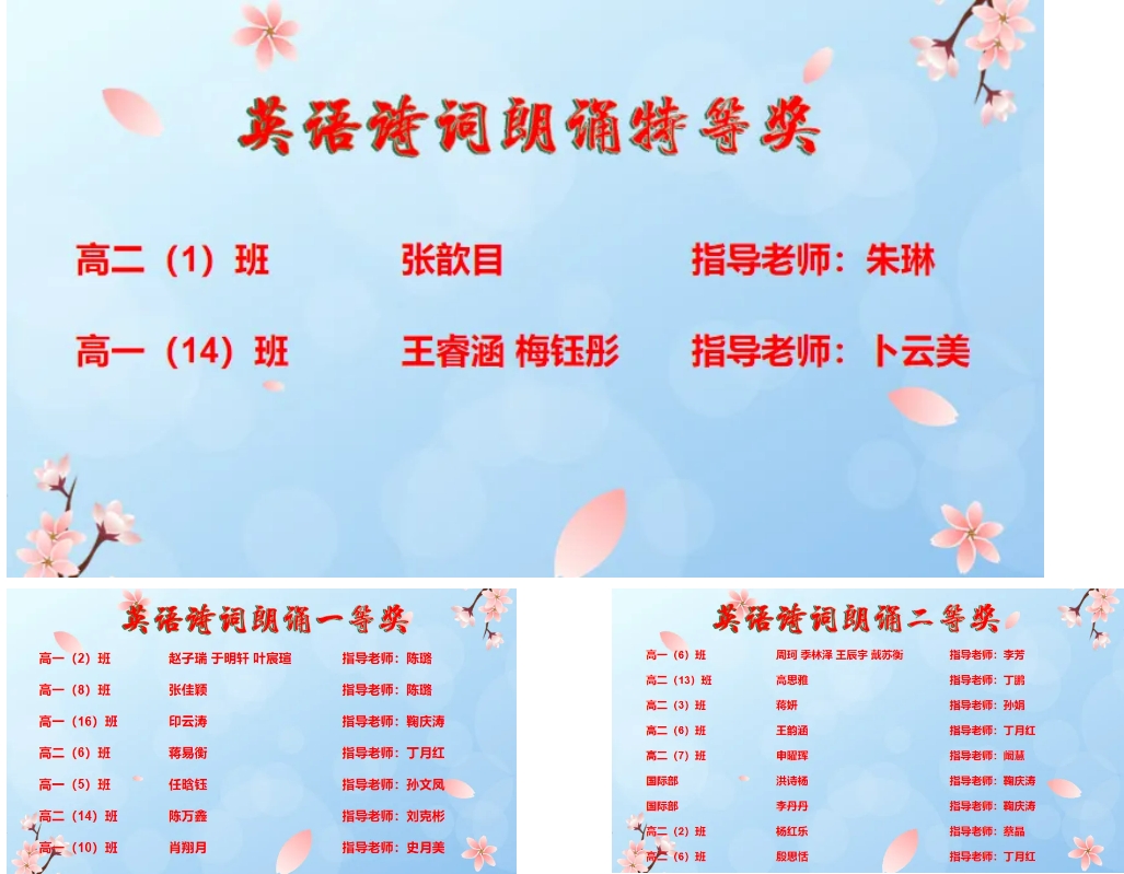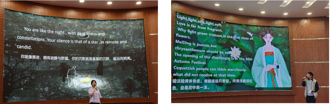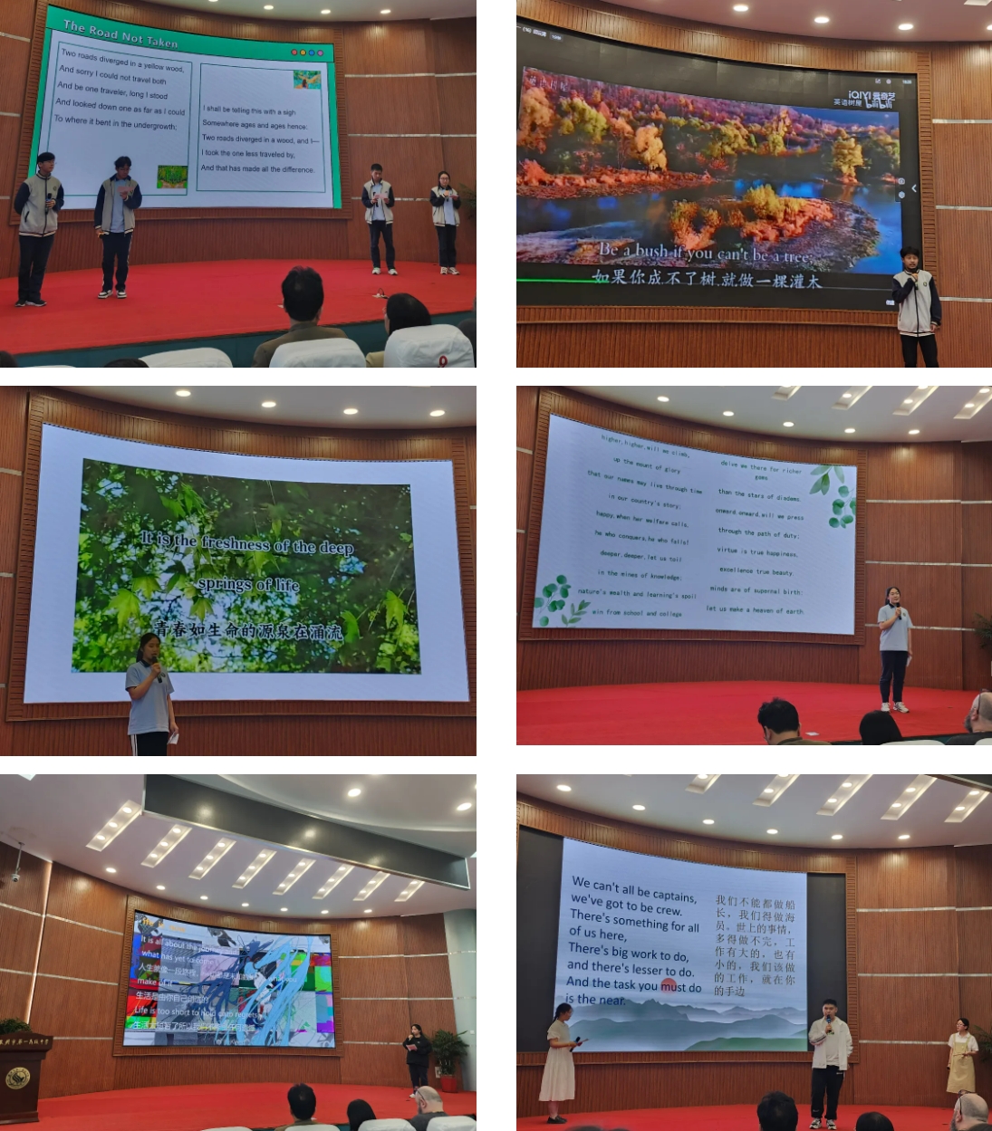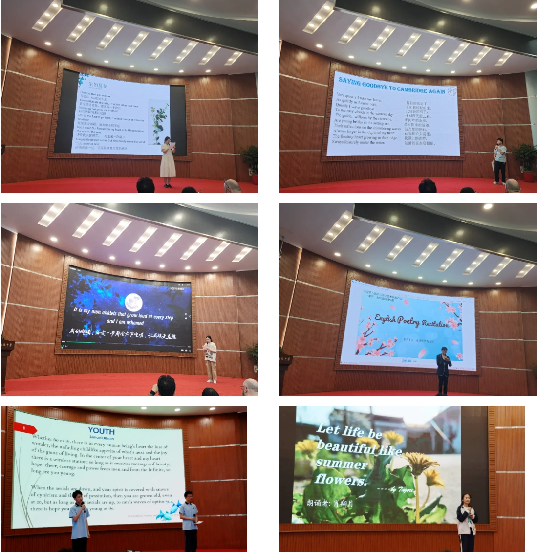 学好英语是为用,言志传情抒胸臆。5月16日晚,来自高一、高二年级和国际部的14组选手在英语诗歌朗诵会上激情演绎,用流利的英语吟诵世界经典名篇。高二(1)班张歆目分享了智利诗人聂鲁达的《I Like You to Be Still》,独特的嗓音和深情的演绎让同学们感悟到爱情的美好和纯粹。高二(2)班蒋研的《Life is Now》让人深刻反思生命的真谛。高一(10)班肖翔月朗诵了泰戈尔的《Let Life be Beautiful Like Summer Flowers》,让人懂得珍惜人生的每一个瞬间,活出自己的精彩和价值。高一(14)班王睿涵、梅玉彤吟诵了朗费罗的《A Psalm of Life》,激励同学们要拥有积极向上的人生态度和价值观念。国际部洪诗杨、李丹丹分享了惠特曼的《O Captain! My Captain》,她们深情的朗诵让同学们感受到了人性的光辉和伟大,激励着同学们不断追求更高远的目标……