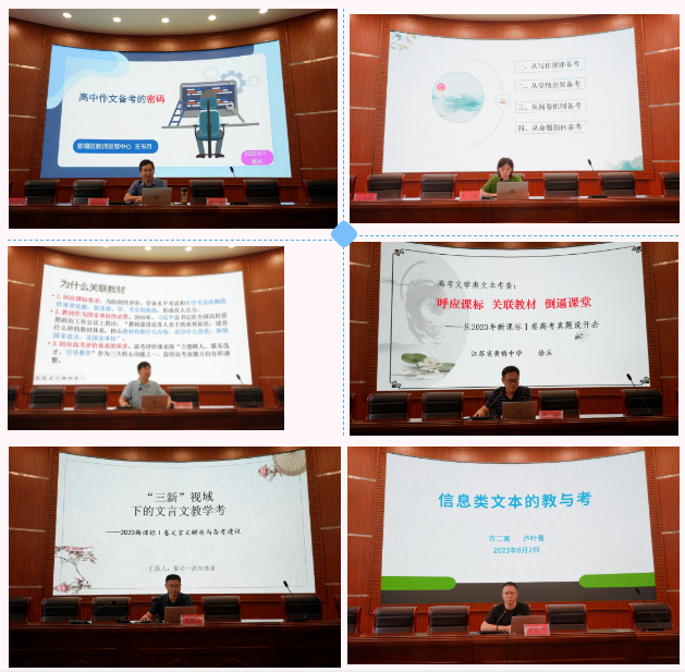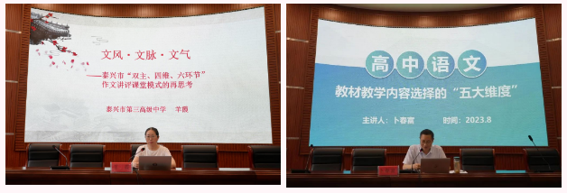 泰兴市教师发展中心研训员王亚声主持高中语文学科培训。摒弃了高深的理论研究,聚焦高中语文教学中的重点问题,本次活动奉上了一道融经验“碰撞”与技能“实训”的大餐:姜堰区教师发展中心王书月、泰兴中学叶琳、泰兴三高羊霞做作文专题讲座;泰兴中学尹继东、黄桥中学徐兵、泰兴一高朱继承、泰兴二高卢叶青聚焦2023年高考真题进行探讨;泰兴二高卜春富、教师发展中心王亚声围绕新教材教学内容选择、课堂教学转型等作深入剖析。整个培训高处着眼,实处着手,内容丰富,一场场兼具前瞻性与实用性的讲座让所有参训教师获益颇丰。