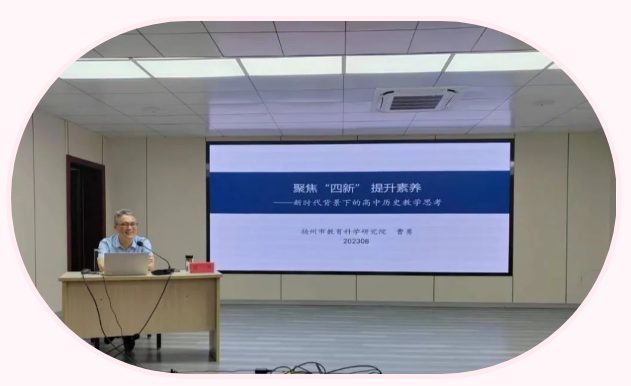 泰兴市教师发展中心研训部主任蔡鑑民主持高中历史学科培训。扬州教育科学研究院曹勇、泰兴一高卢春建等作专题讲座。基于核心素养、“四新”背景、2023年高考真题,本次培训既有高屋建瓴的历史教育思想阐述,也有实用高效复习备考策略分享,“真”而“实”的培训为所有教师指明了新时代背景下历史教学的破局思路,也突出显示了教育科研的重要性。