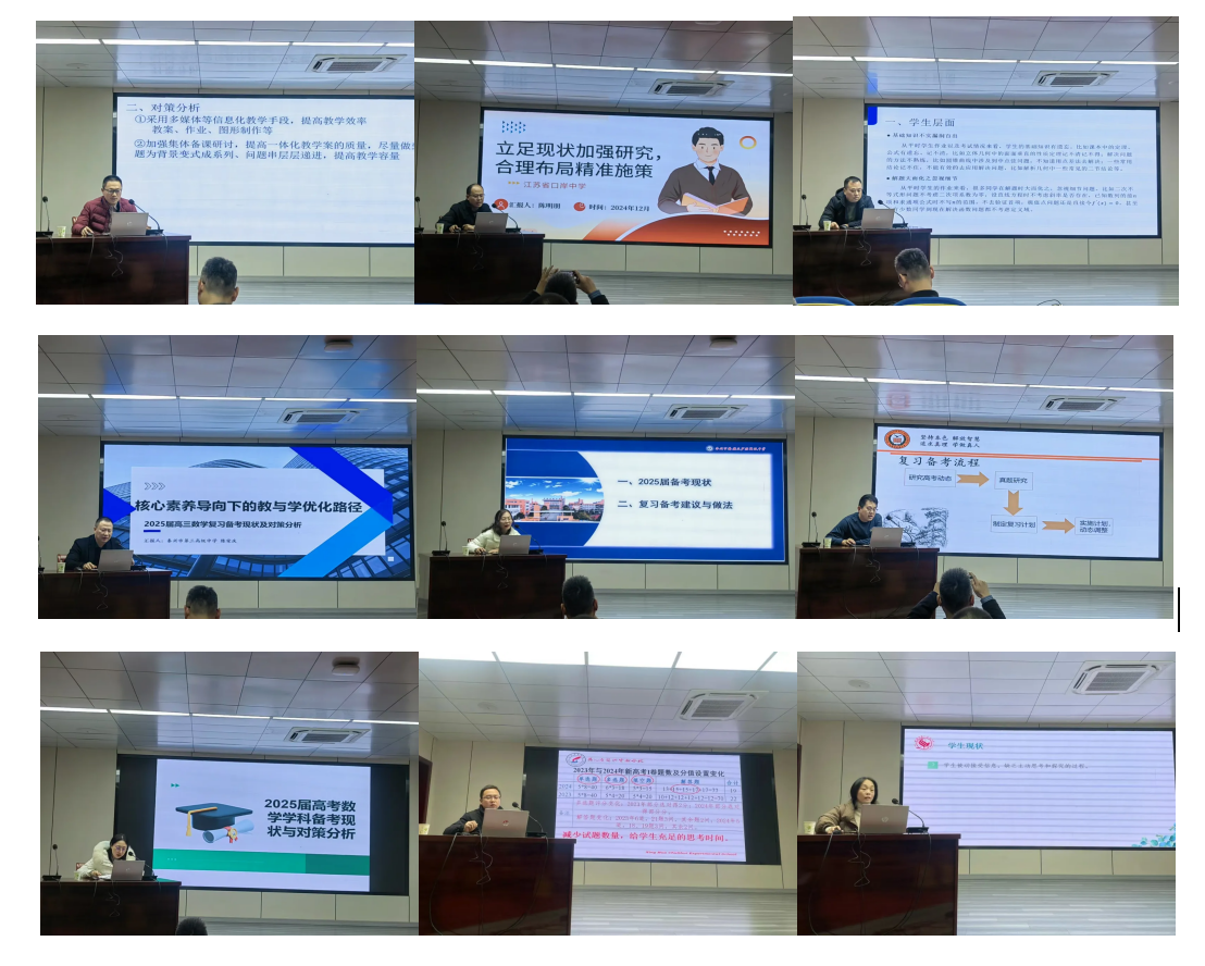 九所学校代表以“2025高考数学备课现状与对策分析”作交流与探讨。泰州教研室吴春胜主任对后期的高中数学教学提出明确要求:高质量开展集体教研,扎实推进集体备课;课堂要讲实效,训练要精准;各校要认真学习并落实会议内容及要求。