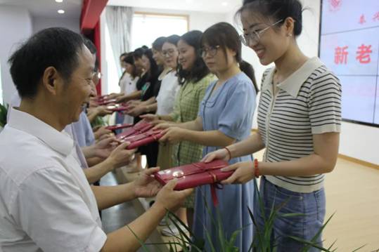2021年入职教师王萃、2020年入职教师吕成曦交流了近一两年的工作体会。他们感恩学校、感恩身边有很多经验丰富且乐于分享的老教师们并借此机会表达谢意。2022年新入职教师刘金玲、梁媛媛、徐婷婷作为代表发言。她们表示:要以老教师为学习榜样,牢记教育初心,将个人的成长融入到学校事业发展中,尽快转换角色,适应新环境、新岗位,为学校发展贡献智慧和力量。