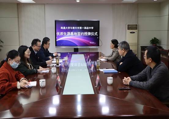 曹军副校长代表泰兴一高与南通大学签署《南通大学优质生源基地建设合作协议书》,曹勇书记将“南通大学优质生源基地”牌匾授予泰兴一高并合影留念。