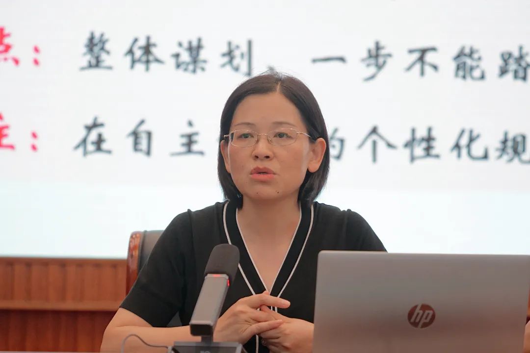 教务处主任蔡琳娜从完善“三年一体”教学规划、规范“三单式”校本教学案编写、深化“跨学科融合研究”、落实“主题式”研讨课等方面明确了本学期教学工作的重难点,并围绕本学期工作计划进行部署。