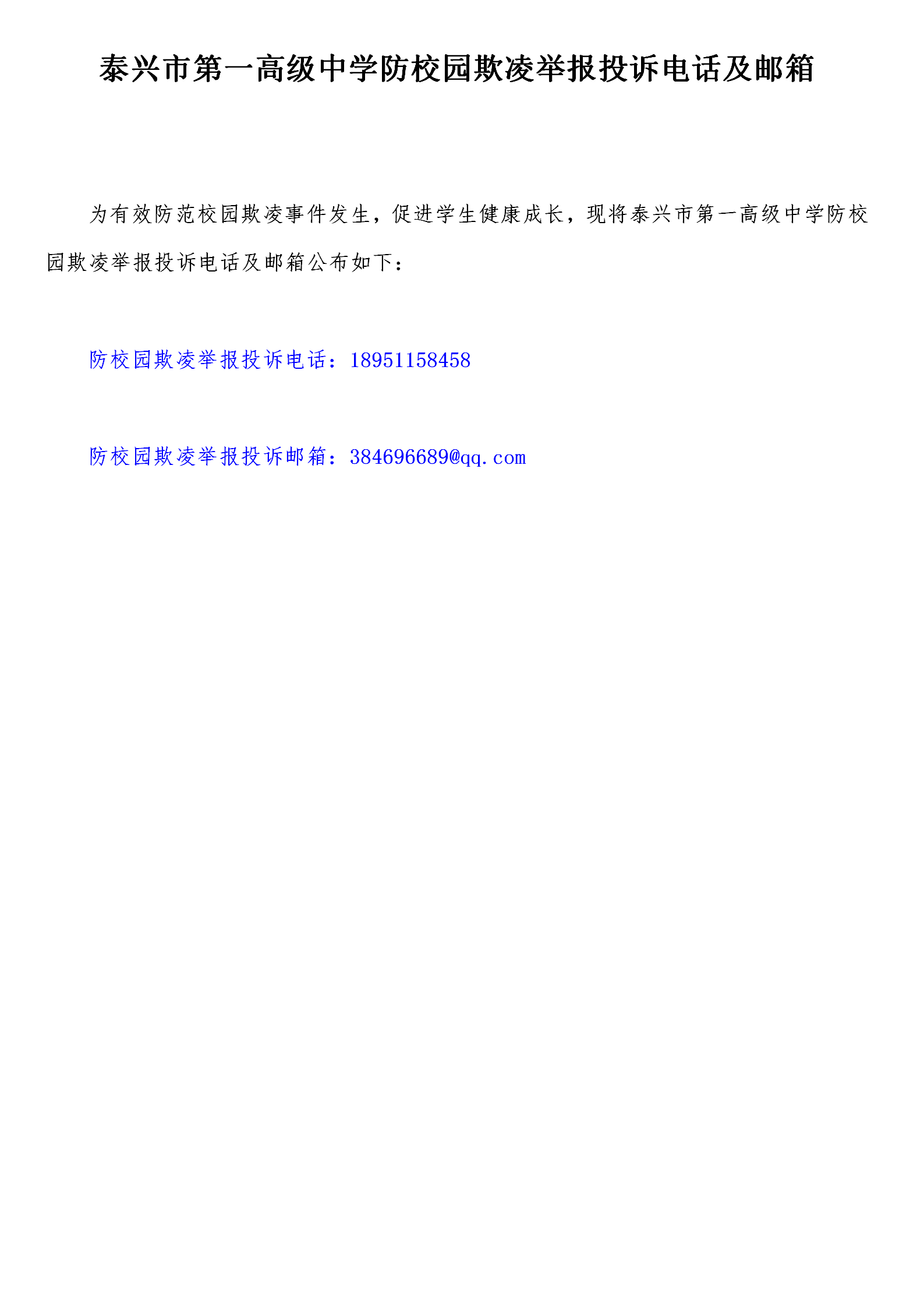 泰兴市第一高级中学防校园欺凌举报投诉电话及邮箱