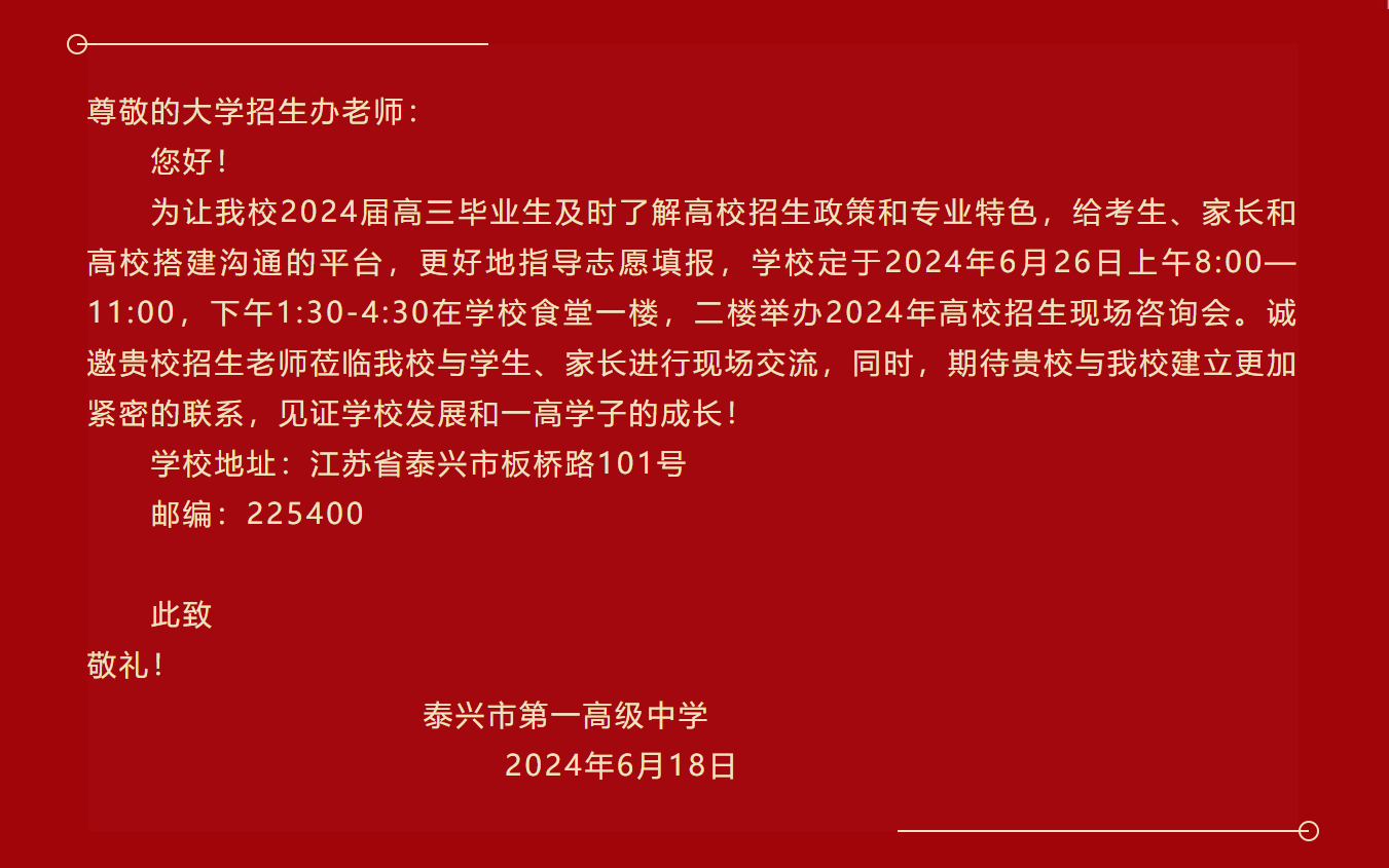 邀请函︱泰兴市第一高级中学2024年高校招生现场咨询会