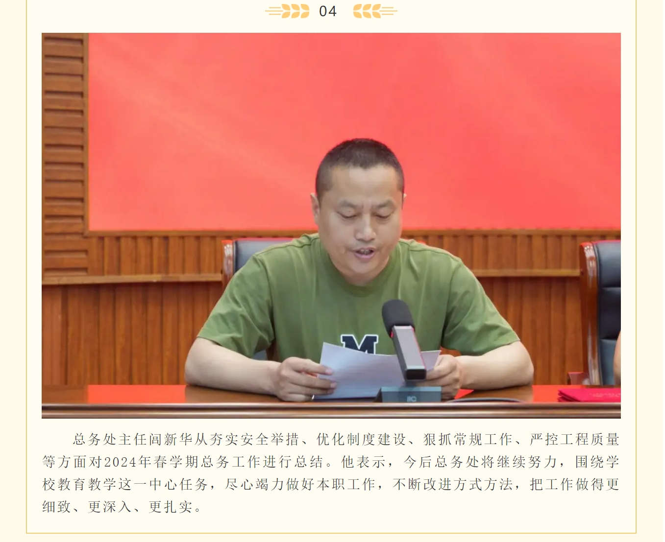 顾琴副校长从三个方面总结了教学、教研工作:督导保障,推进重点工作;活动渗透,提升师生素养;研究引领,加强师能建设。同时她提出了下一学期的教学、教研工作重点:加大教师队伍建设力度,厚植师德师风;优化尖子生培养策略,做好保苗育苗;发挥学科核心团队作用,放大优师优能;锚定课堂教学质量提升,聚焦提质增效;狠抓既定关键“任务”,确保达标达优。