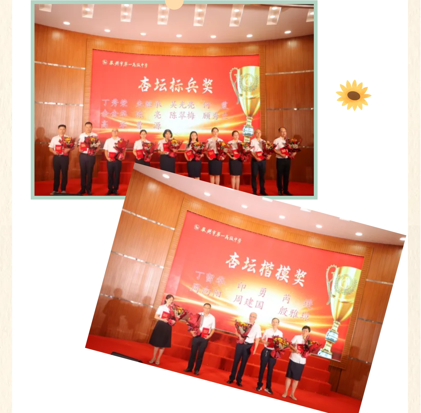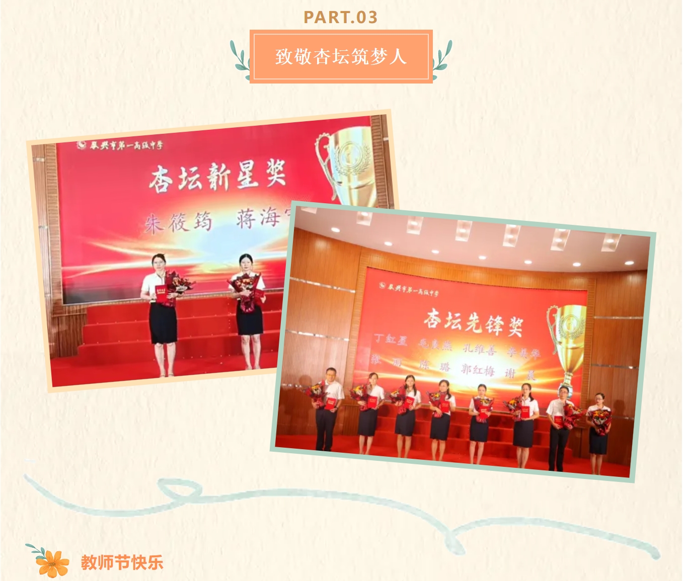 玉壶存冰心,朱笔写师魂。一代代一高人为一高再高勤勉奉献、为一高更高团结进取、为一高必高接续奋斗,他们鬓染霜华却奋斗不止、披星戴月却甘之如饴、栉风沐雨却淡泊名利……庆祝活动上,部分优秀教师被授予一高“杏坛功勋奖”“杏坛楷模奖”“杏坛标兵奖”“杏坛先锋奖”“杏坛新星奖”。他们是一高精神的象征,是一高力量的脊梁,是一高团队的代表,他们默默无闻、任劳任怨,他们一丝不苟、方正行稳,他们精耕善思、业绩突出,他们用自己的智慧、学识、勤奋铸就一高闪光的昨天、定格一高幸福的今天、托举一高更辉煌的明天。