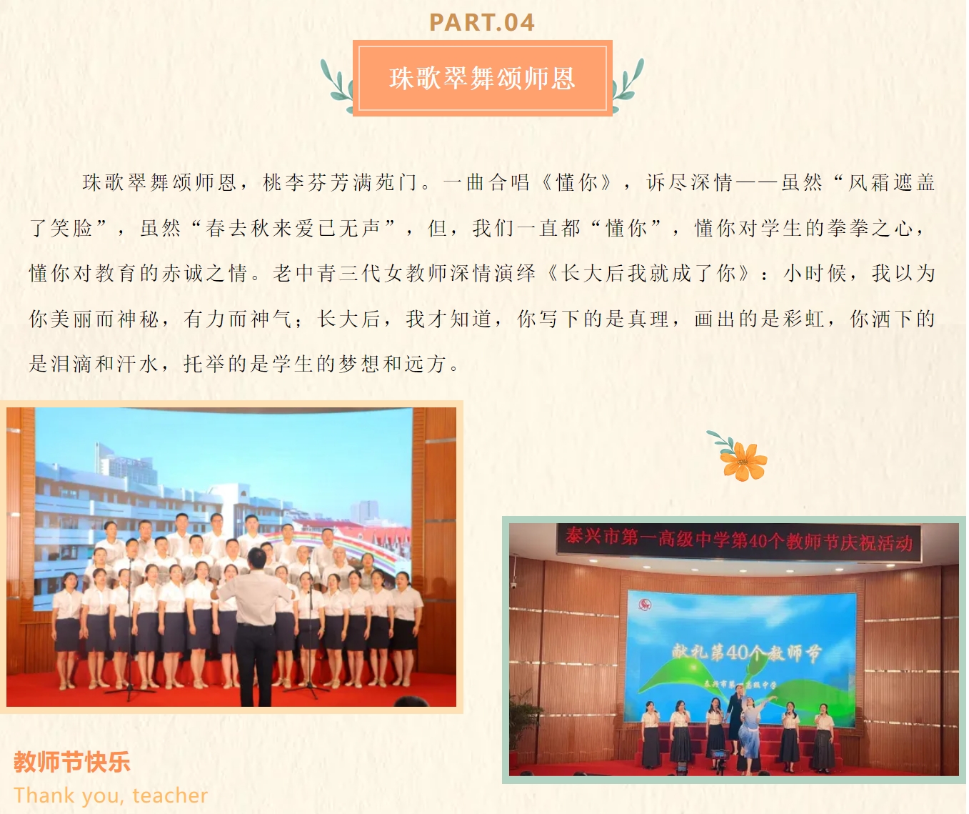 每一个教师节,都是一次见证,见证学校的发展、见证教育人的奋斗;每一个教师节,都是一次生长,是一高师生的生长、是一高教育的生长!学校未来发展的画卷已经铺就,让我们一起以智慧为笔、以创新为墨,共同书写泰兴一高高质量发展的新篇章。