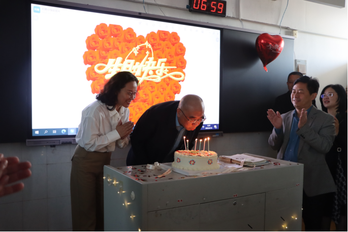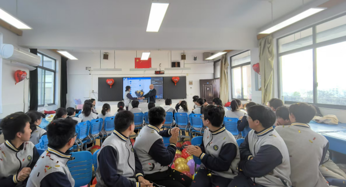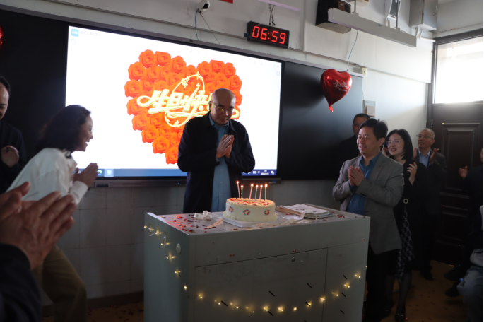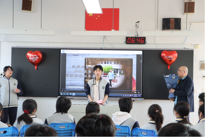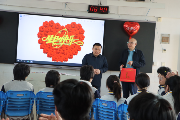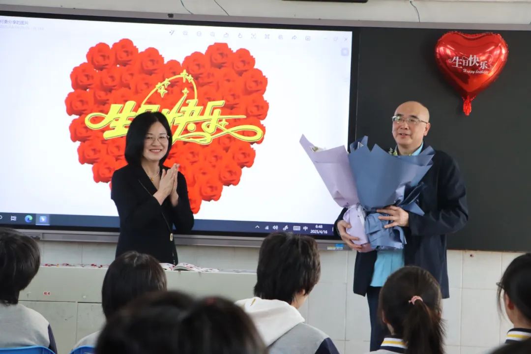 周建国老师走进教室的瞬间,此起彼伏的祝福声响起:“祝周老师生日快乐!”五彩的花瓣似灵动的蝶群翩跹飞舞,点燃了喜庆欢乐的氛围。