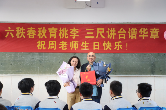 学生主持人将鲜花呈递给周老师,并送上诚挚的祝福。