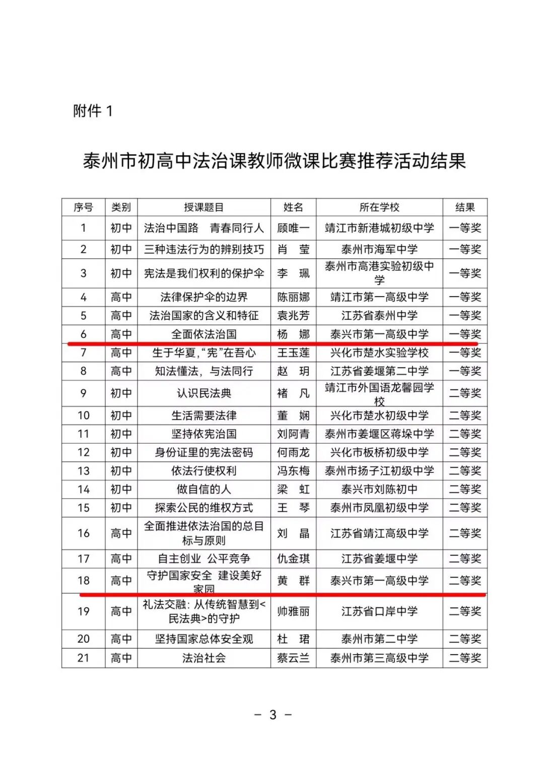 我校杨娜、黄群老师在泰州市初高中法治课教师微课比赛中分获一、二等奖。