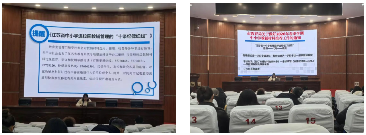 蔡琳娜主任宣读《江苏省中小学进校园教辅管理“十条纪律红线”》,评议小组对2026年春季学期教辅材料开展推荐评议工作。