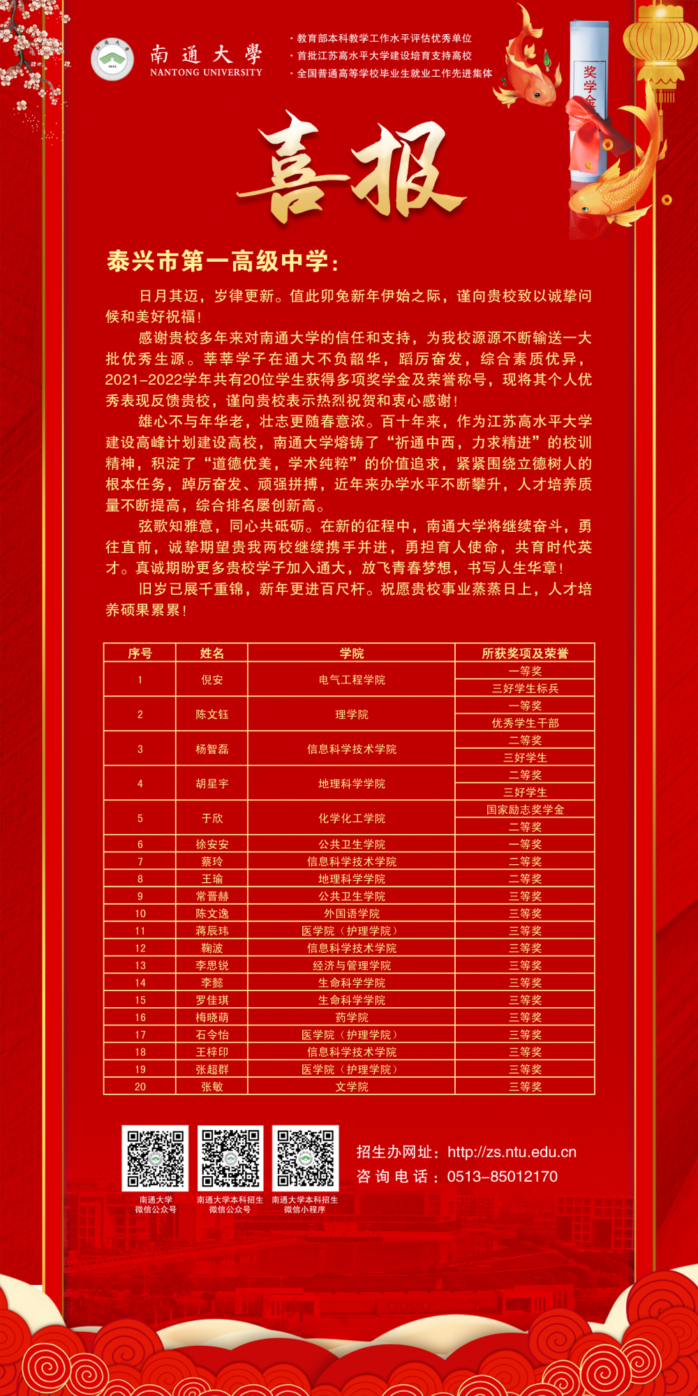 喜报频传获佳绩,奋楫扬帆正当时。泰兴一高毕业生倪安等